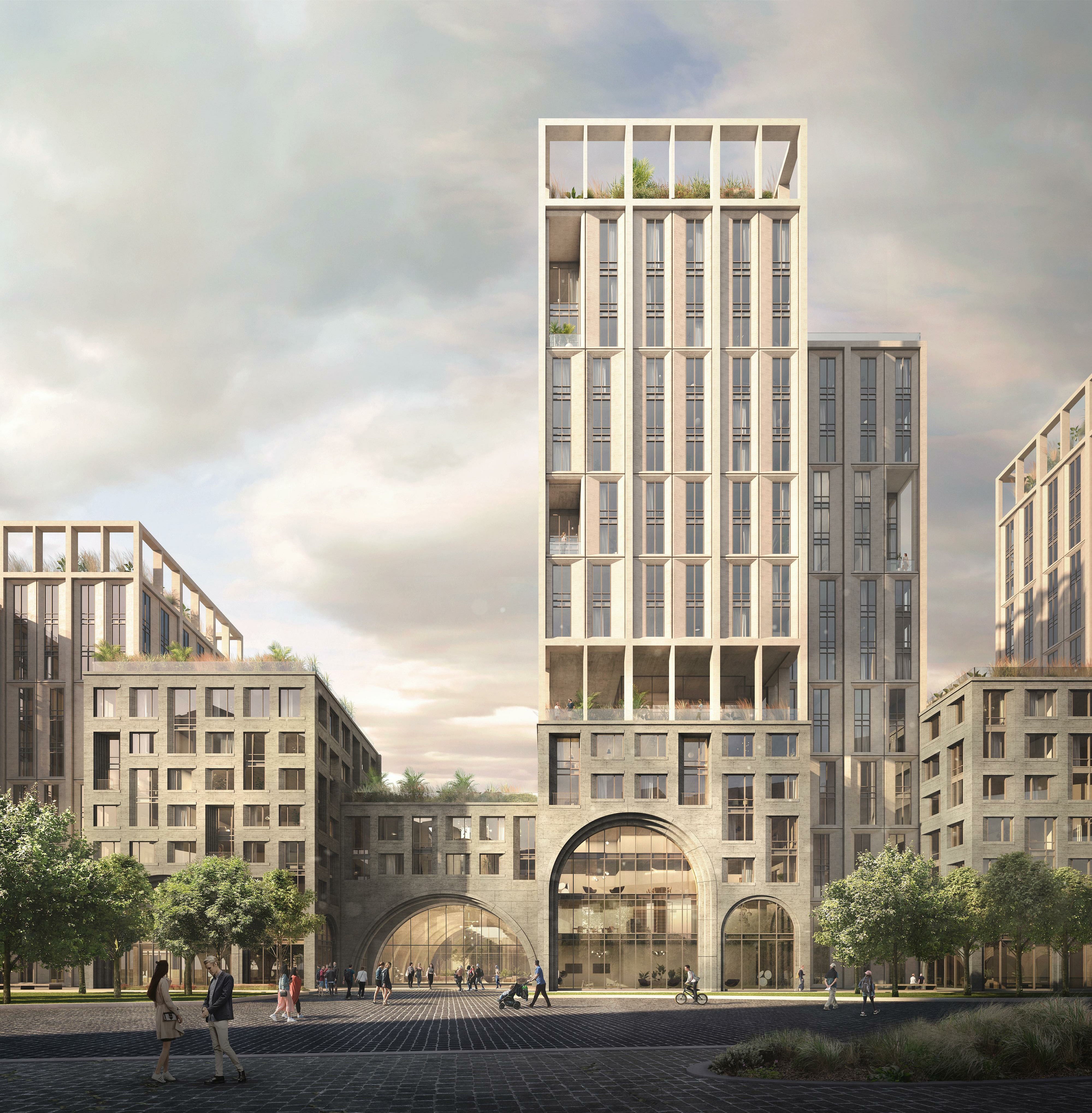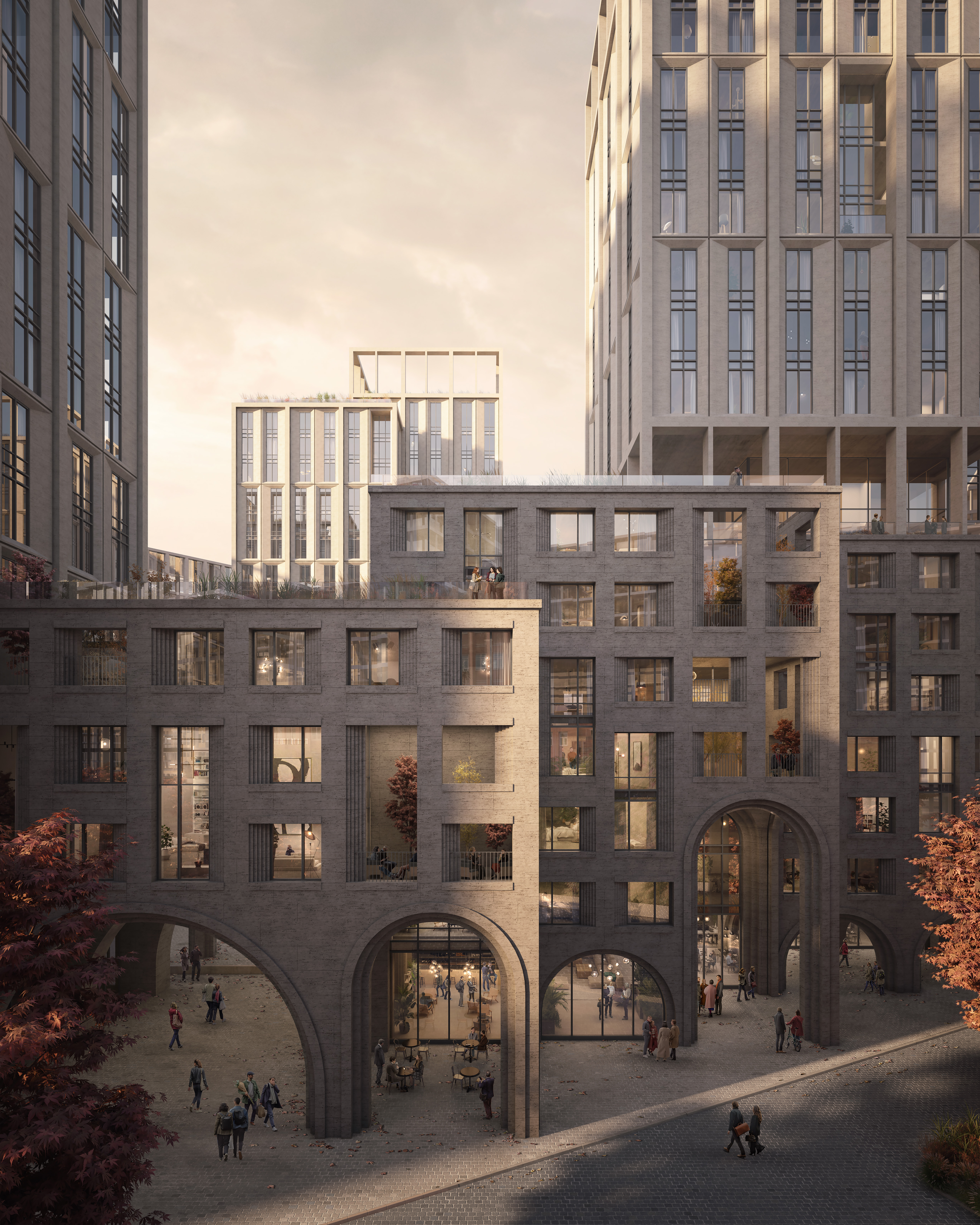 В цветовом решении жилого квартала прослеживается преемственность архитектуре Кутузовского: терракотово-графитовая облицовка нижних этажей отсылает к домам 1930–1960-х годов, а золотисто-песочная отделка верхних этажей напоминает о легендарных столичных высотках и современных небоскребах «Москва-Сити». Еще один важный элемент, отдающий дань архитектуре Кутузовского 40–50-х годов ХХ века, — многочисленные арки разных высот и размеров. Они, с одной стороны, сохраняют дух проспекта, а с другой — создают эффект парения зданий.