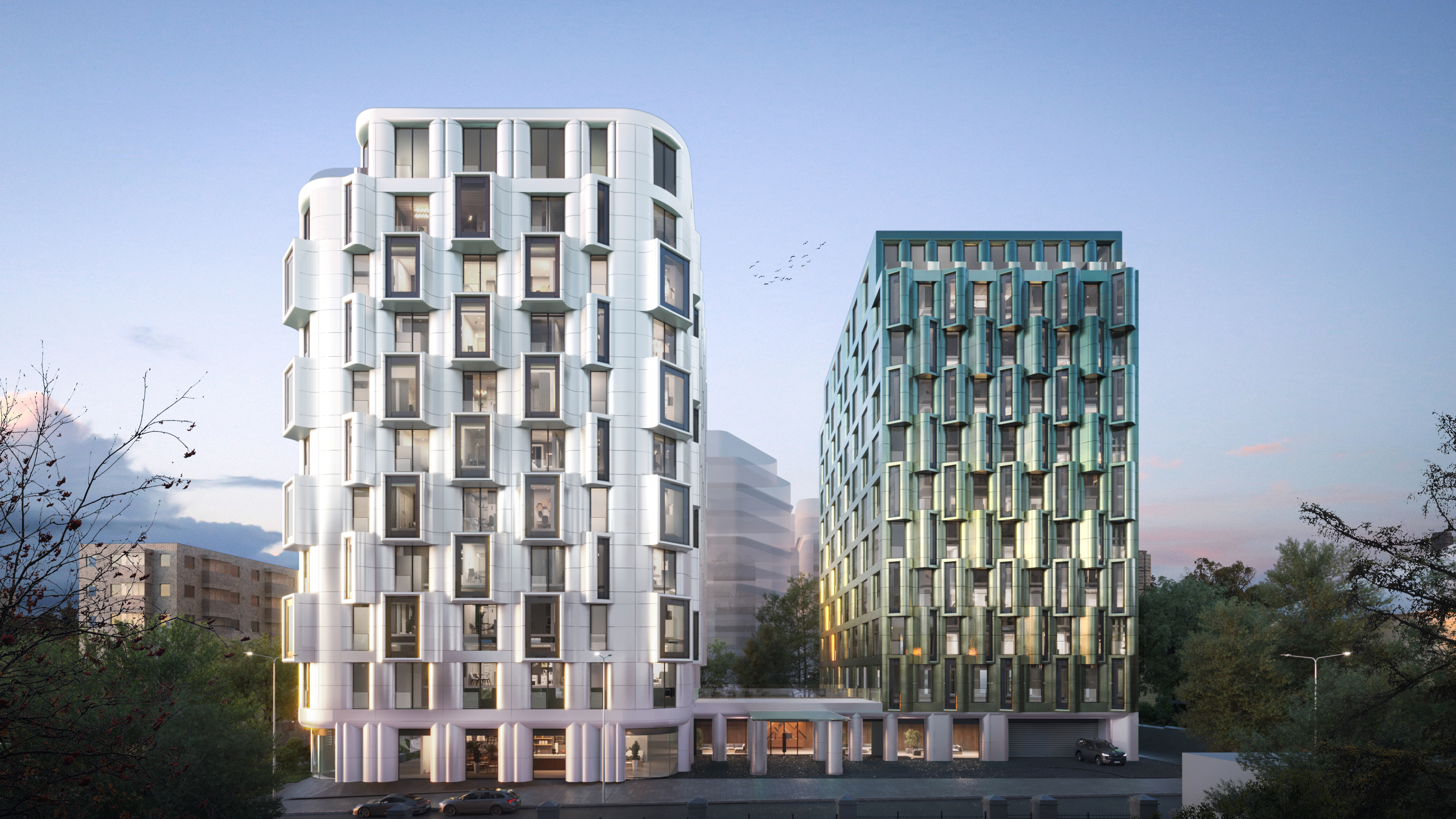 Архитектурную концепцию проекта разработало бюро GAFA Architects. Фасады двух строений будут выполнены из объемной керамики в природных цветах — жемчужном белом и патинированном зеленом. При производстве панелей будет использована технология горячего глазурования, цвета для которой подбираются вручную. Динамичность фасада достигается за счет чередования эркеров и балконов в шахматном порядке.