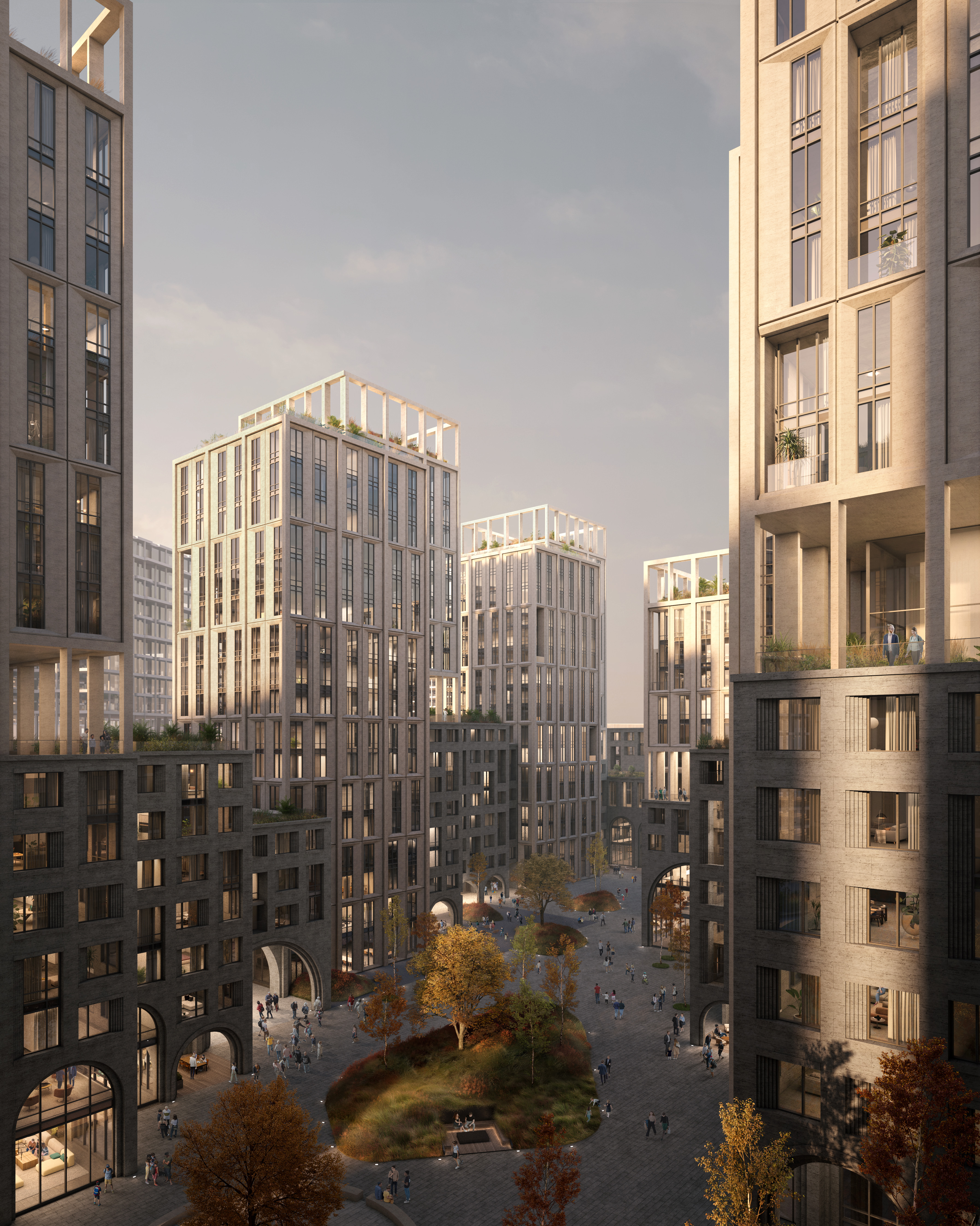 В цветовом решении жилого квартала прослеживается преемственность архитектуре Кутузовского: терракотово-графитовая облицовка нижних этажей отсылает к домам 1930–1960-х годов, а золотисто-песочная отделка верхних этажей напоминает о легендарных столичных высотках и современных небоскребах «Москва-Сити». Еще один важный элемент, отдающий дань архитектуре Кутузовского 40–50-х годов ХХ века, — многочисленные арки разных высот и размеров. Они, с одной стороны, сохраняют дух проспекта, а с другой — создают эффект парения зданий.