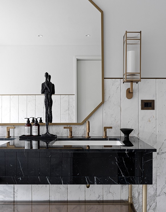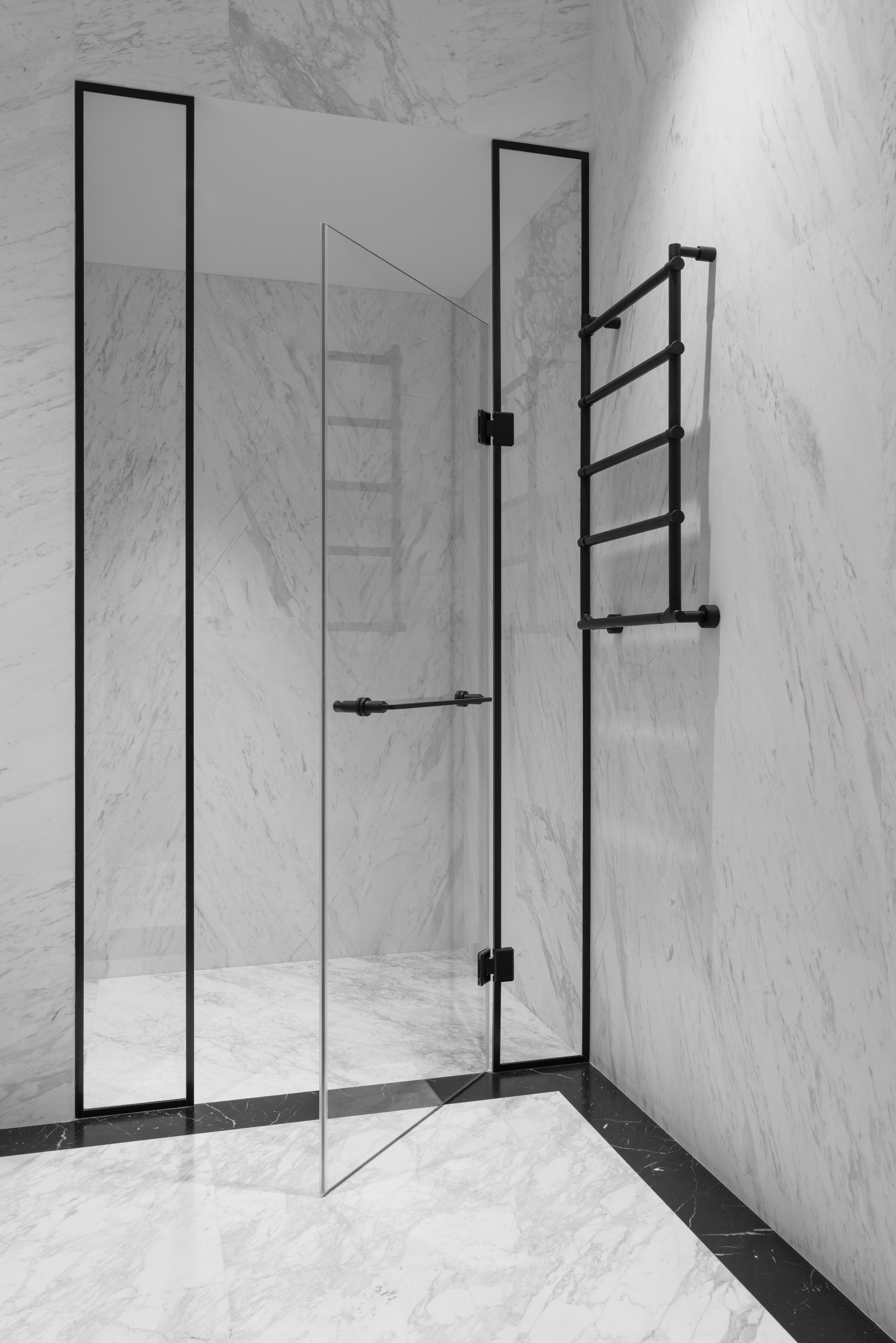 Просторное лобби выполнено в благородных теплых тонах. Темный и светлый мрамор пола поддерживает геометрию элементов из матового стекла и золотистого металла, разделяющих лобби и lounge-зону. Строгость форм и супрематистский ритм вертикальных линий в отделке и декоре уравновешиваются мебелью, в которой преобладают мягкие, округлые силуэты.
