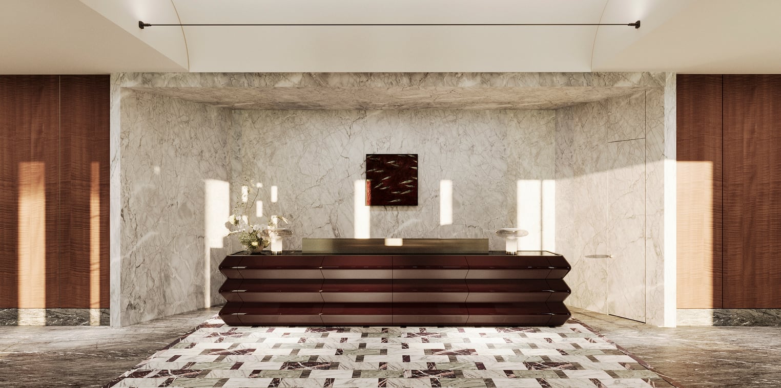 Дизайн лобби вдохновлён итальянскими мотивами 60-х. Мраморный портал раскрывается трапециевидной формой, стойка из широкоформатной керамики — та же, что на фасаде — становится якорем пространства. Входные двери отсылают к Villa Necchi Campiglio в центре Милана. Деревянные панели создают шелковистые переливы на стенах, а мраморная мозаика пола повторяет ритм фасадов.